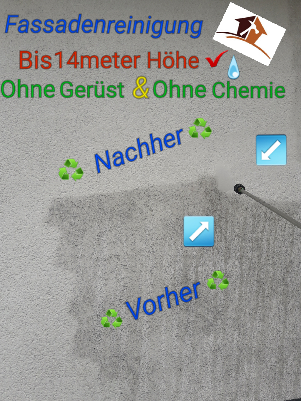Früher oder später setzen sich Moose, Algen, Pilze, Flechten, Grünbelag, Spinnweben und Efeu in Ihrer Fassade fest. Eine professionelle Reinigung der Fassade schont die Umwelt, die Fassade und Ihren Geldbeutel – denn ein Neuanstrich ist deutlich teurer und aufwendiger! Fassadenimprägnierung machen wir ohne Gerüst somit gibt es keine lange Wartezeiten ,denn wir arbeiten mit Teleskoplanzen und  bis zu 14 Meter ohne Gerüst mit einer Spezial Reinigungsmaschine ganz ohne Chemie. Sie können uns nicht vergleichen, aber Sie können uns kostenlos testen. Nach unserer Arbeit sehen Ihr Dach, Fassade und Hof wieder wie neu aus.